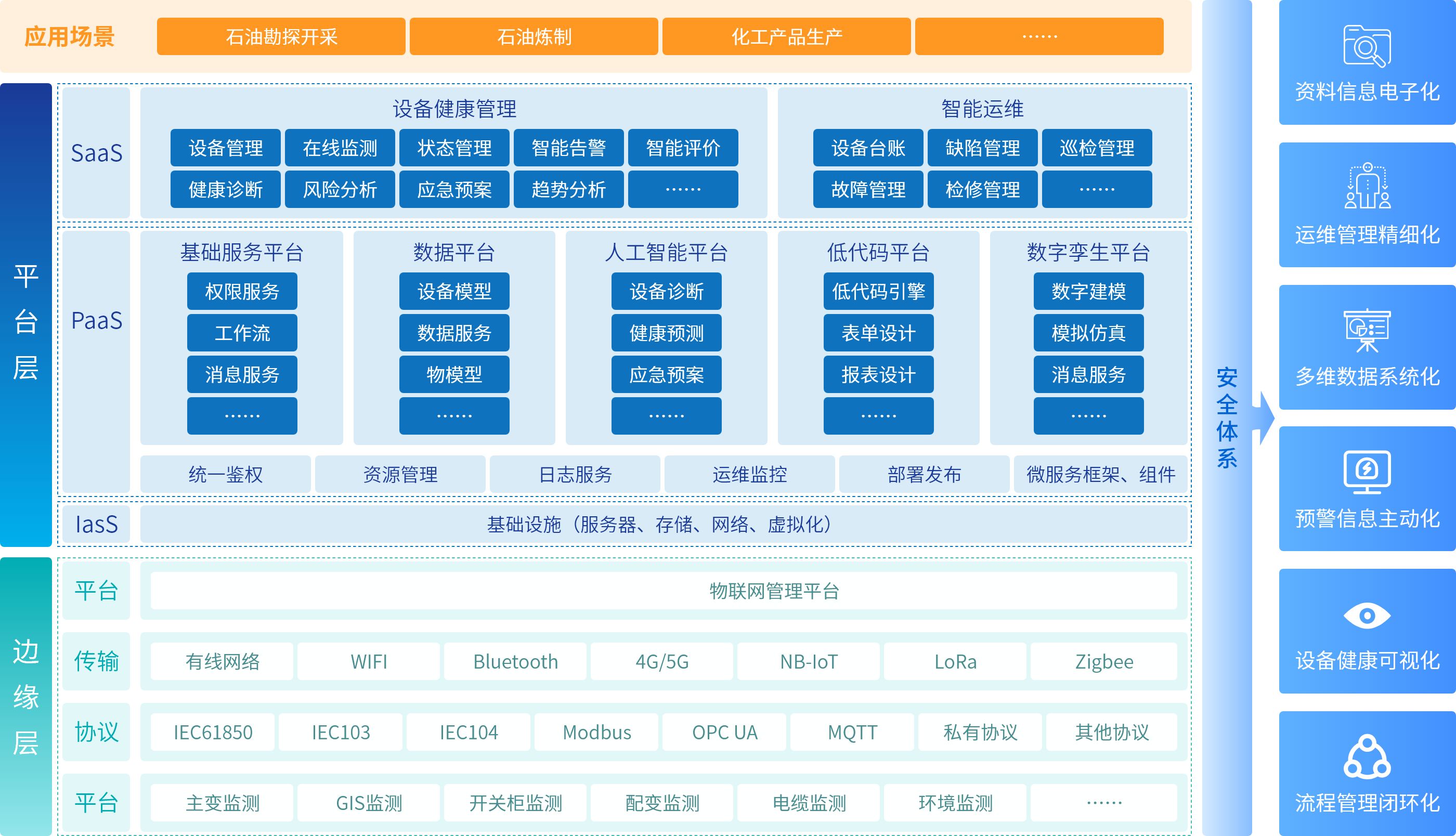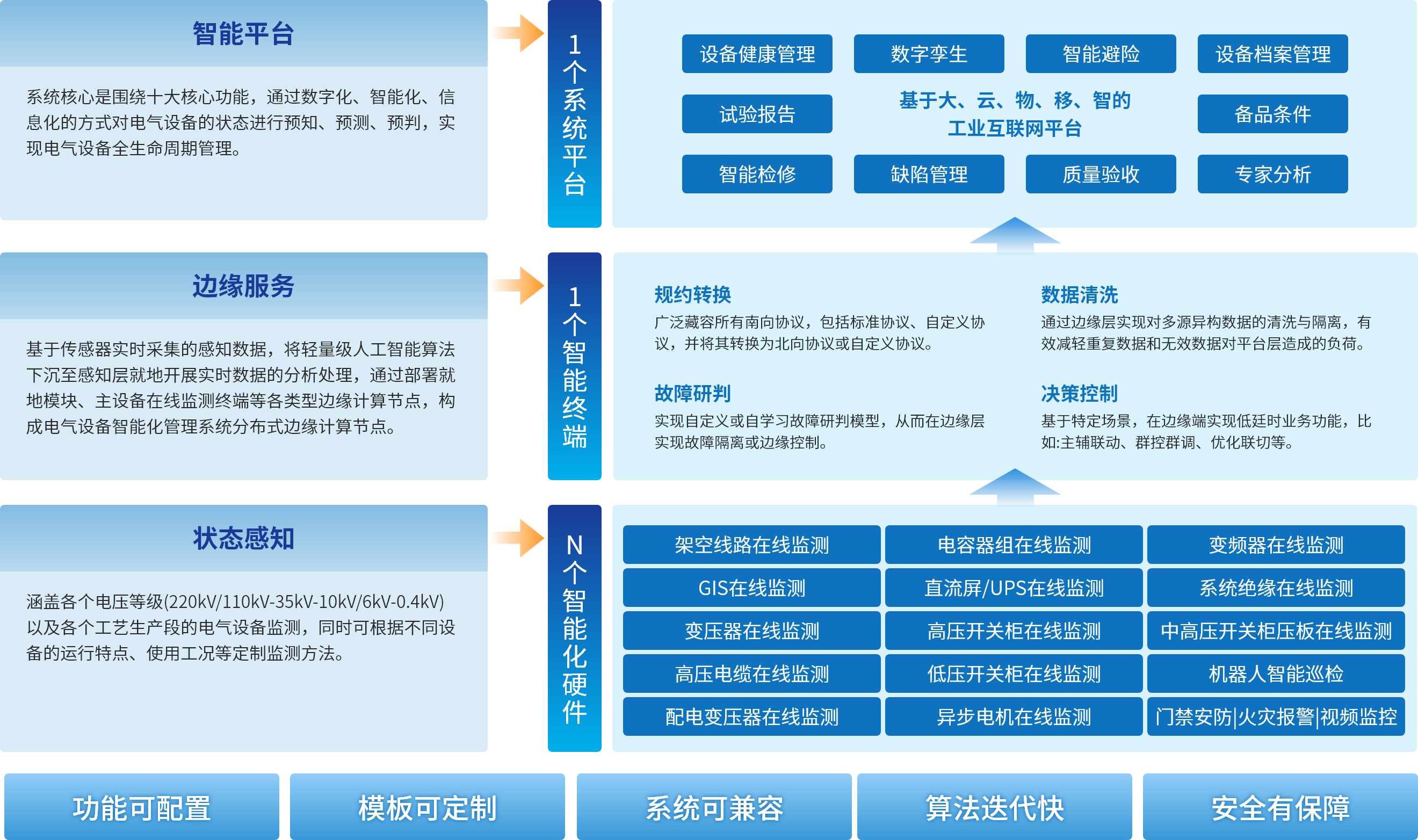 電氣智能化管理系統是基于萬(wàn)物互聯(lián)的工業(yè)互聯(lián)網(wǎng)平臺,采用邊緣云、數字孿生、人工智能、設備健康預測分析算法等新技術(shù)構建的系統。能夠電子化存儲資料、直觀(guān)呈現設備信息和運行工況,實(shí)現多維度的設備健康評估,可有效支撐行業(yè)內部的“三定”工作(定期開(kāi)展電氣設備的檢修、試驗和清掃)及預防性維修工作,提升日常運維效率,有效擺脫經(jīng)驗主義,減少異常的誤報及漏報,在設備故障早期及時(shí)發(fā)現設備隱患,減少非計劃停機,提高運維管理水平和企業(yè)的綜合經(jīng)濟效益。