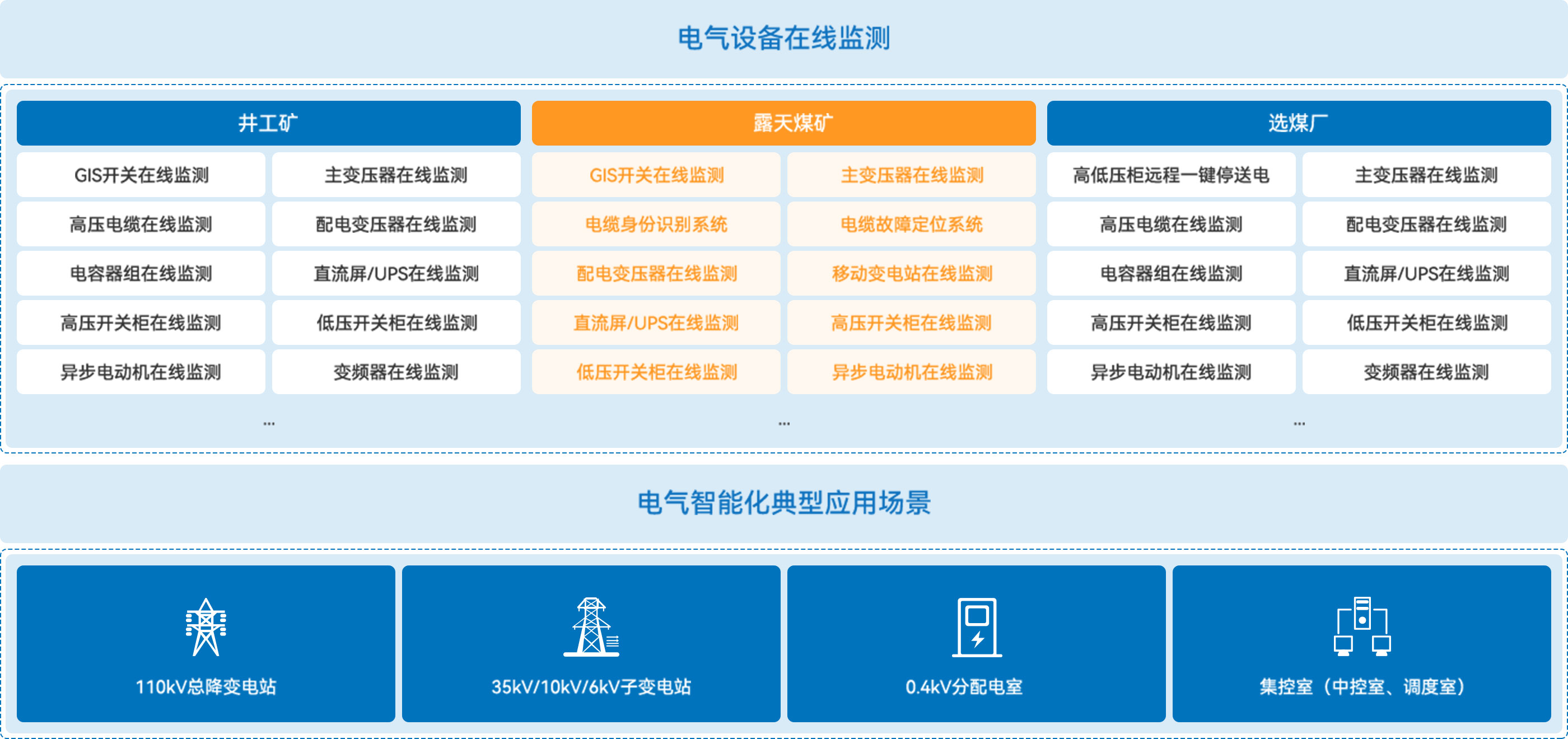 煤炭企業(yè)主要分成井工煤礦、露天煤礦、選煤廠(chǎng)三大板塊,不同板塊依據各自供配電特點(diǎn)進(jìn)行電氣設備的在線(xiàn)監測建設和應用。